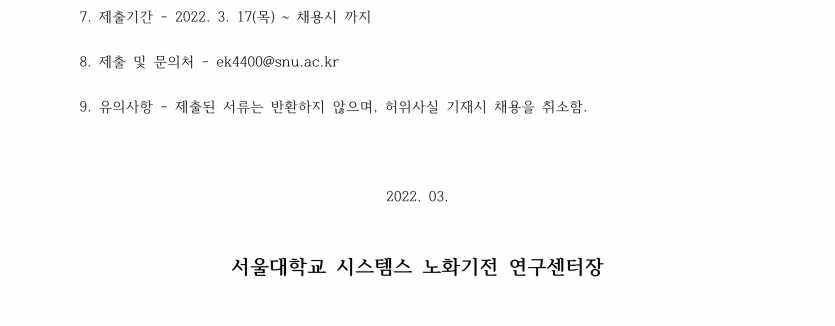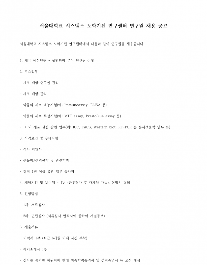서울대학교 시스템스 노화기전 연구센터 연구원 채용 공고
